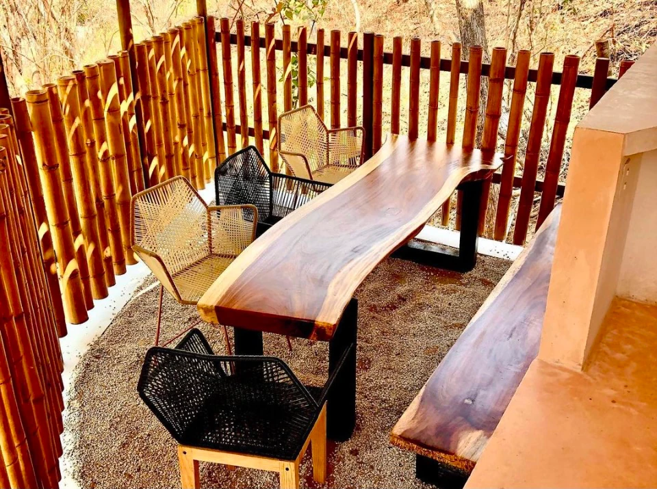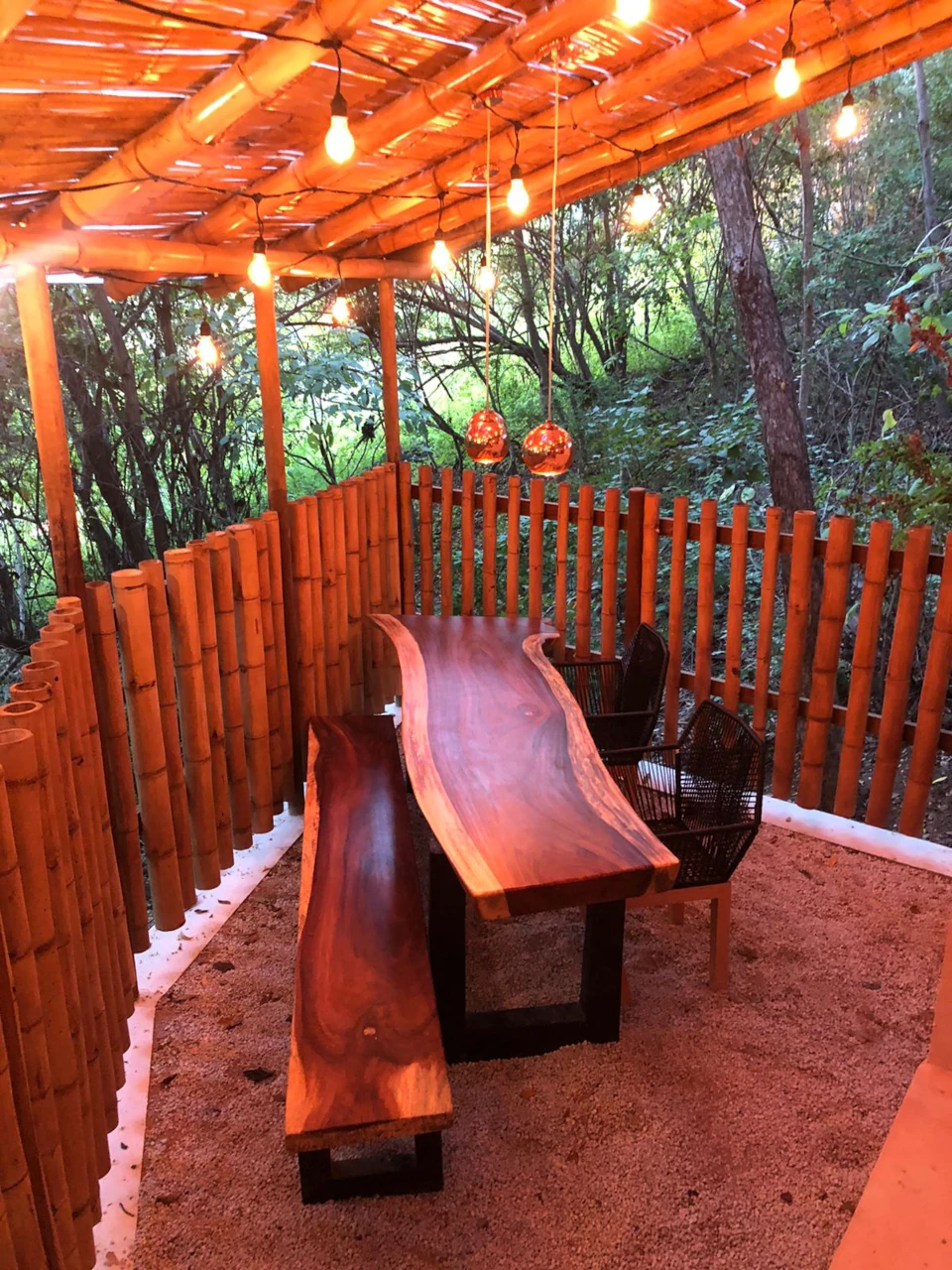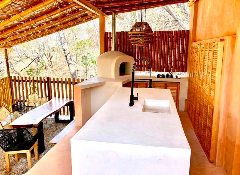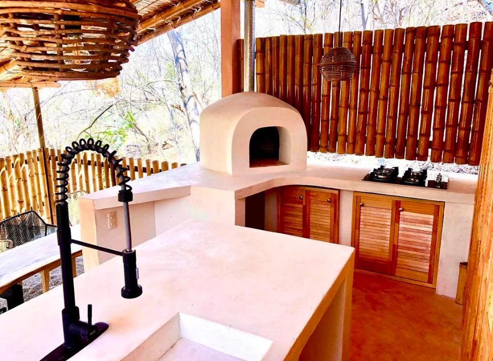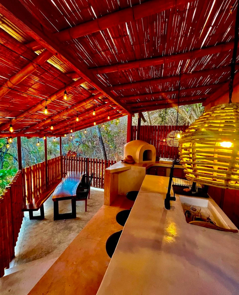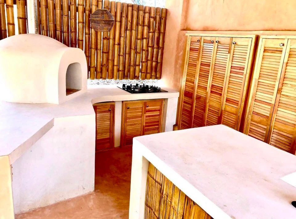 En ella hay un horno para hacer pizzas o pan, estufa eléctrica y un asador al aire libre para asar carnes, pescados o mariscos. La cocina se comparte con los huéspedes de dos habitaciones el Changa Maranga y el Maguila Gorila. Si quisieras ocuparla en algún momento de forma privada solo agenda el espacio con el encargado con previo aviso y listo.