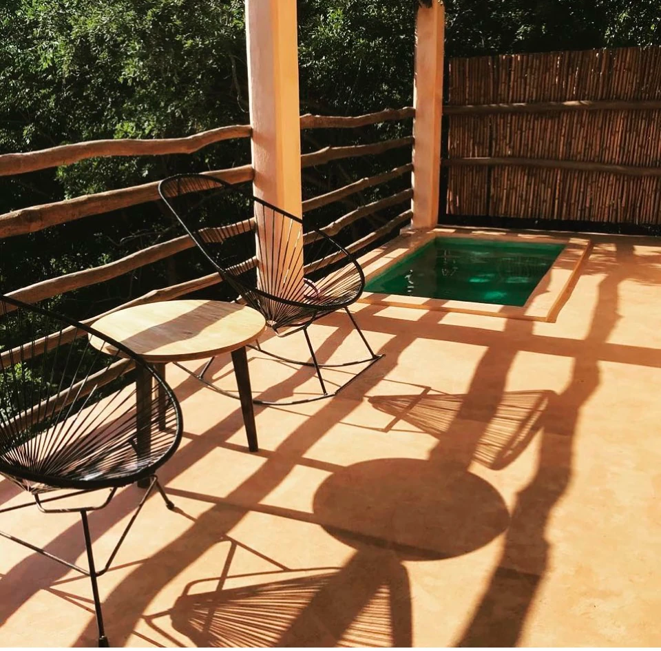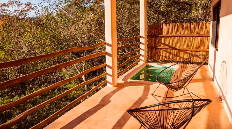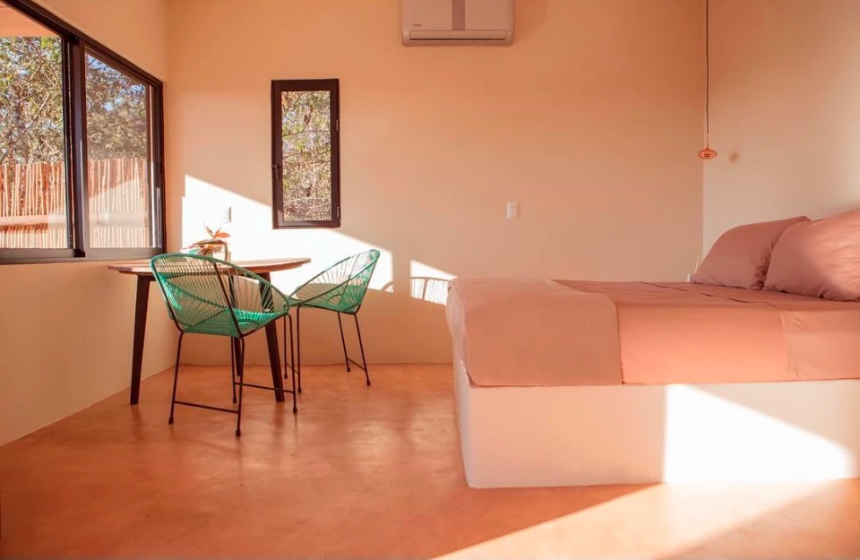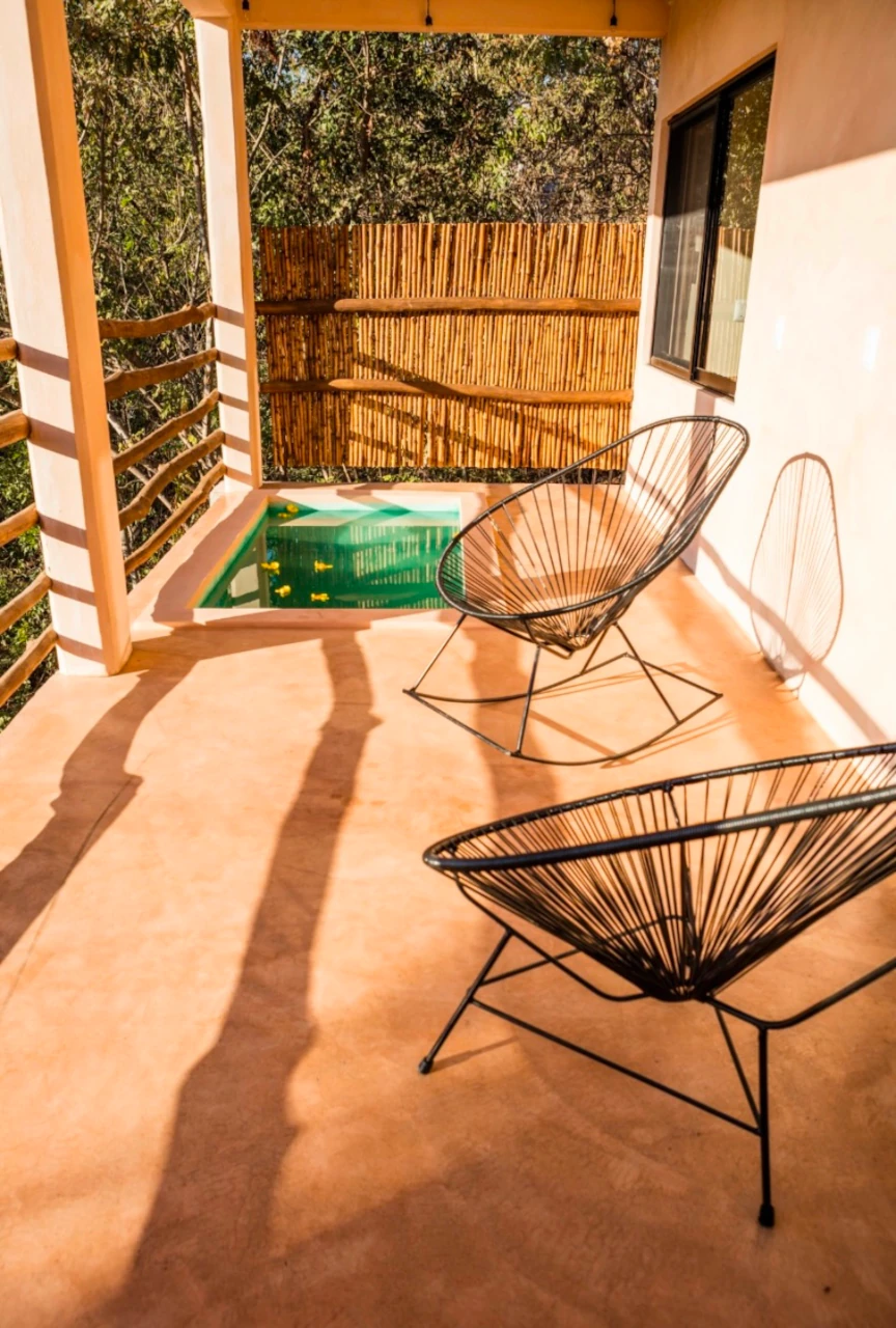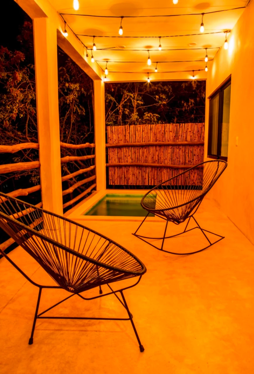 A tan solo 200 metros de la playa, hallarás nuestra habitación, “Maguila Gorila” la cual se encuentra ubicada en la Planta Baja del edificio, ésta habitación está un poco más integrada en la naturaleza de la zona, puede ser que en la terraza entre a saludarte alguna chachalaca que es un ave de la región muy platicadora e inofensiva, también alguna que otra rana, un mantis religiosa o similar, cuenta con una pileta privada en la terraza que te hará pasar un momento relajante y refrescante, dentro de la habitación tienes todo lo necesario para pasar una estancia cómoda, ducha de agua caliente, aire acondicionado, suave ropa de cama, una frazada, frigo bar, cafetera, tés, etc. Además, recuerda que tenemos internet Starlink con 60 Mbps de subida para que puedas ocupar el lugar también para trabajar sin preocuparte de que la conexión sea baja o inestable.